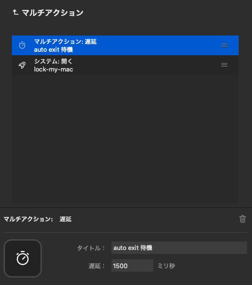 なので、たとえば、 Auto Exit までの待機時間を 1 秒にしてるならば、 delay は 1.5 とするみたいな感じで、うまくタイミングを調整してあげることでいい感じに連携できてる感がでました。